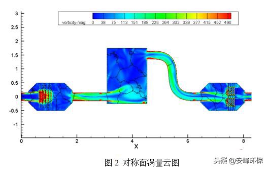 圖2為加入光催化材料后,光催化模塊在入口流量5000m3/h、150°C時(shí)的動(dòng)力學(xué)模擬結(jié)果,通過速度、渦流等流場(chǎng)特性,證明在第一排光催化材料前形成了較為均勻的速度場(chǎng)和密度場(chǎng),氣流穿過第一排光觸媒網(wǎng)后均勻向后流動(dòng)。