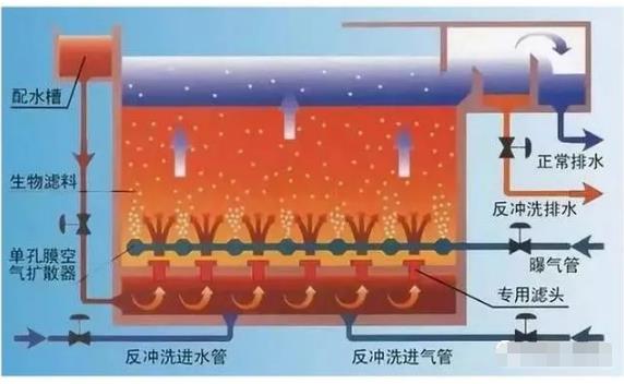 (3)水漂洗:關(guān)閉反沖洗風(fēng)機(jī)和反沖洗進(jìn)氣閥門,進(jìn)行水漂洗,目的是將濾料表面的懸浮物和老化的微生物膜沖洗出去,時(shí)間為3--5min。